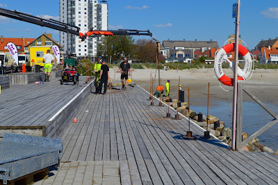 Nere vid badet pågick mycket arbete idag. Det ser ut som om soldäcken skall byggas ut ytterligare, idag pålades det och förde en massa oväsen. Vi flyttade vår båt till mastbryggan eftersom vi ska masta på imorgon tidigt.