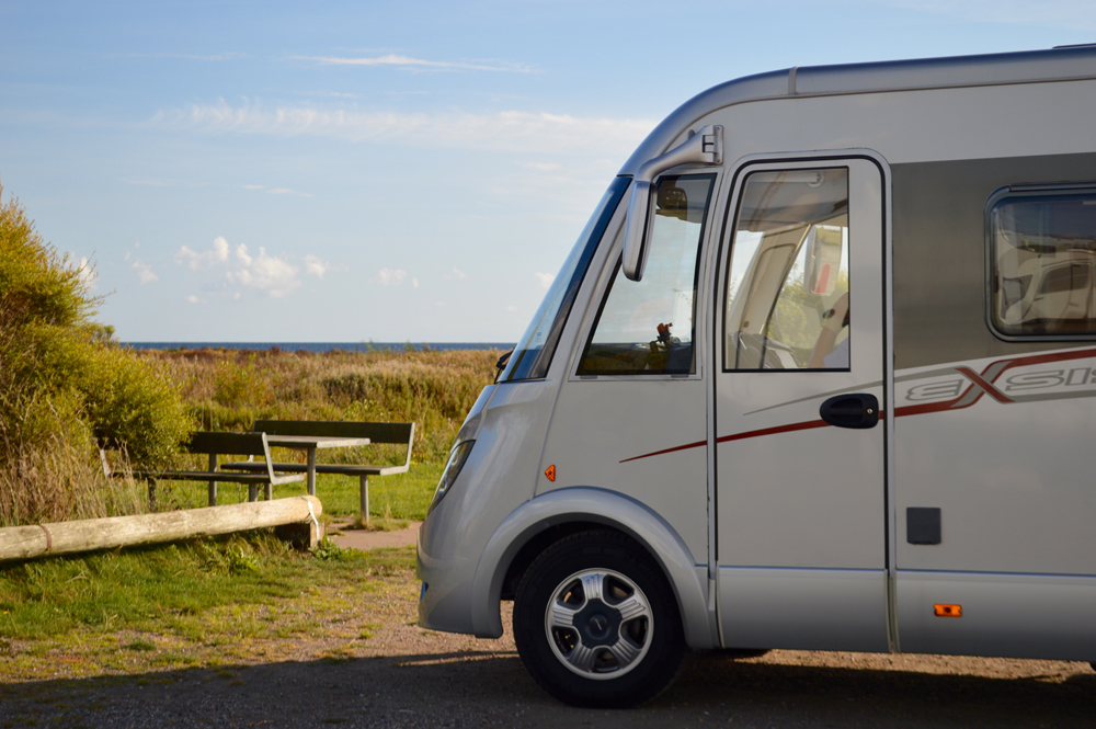 Vi ställde oss på en ställplats nära färjorna vid havet, lika fint väder som vanligt och hur härligt somhelst.