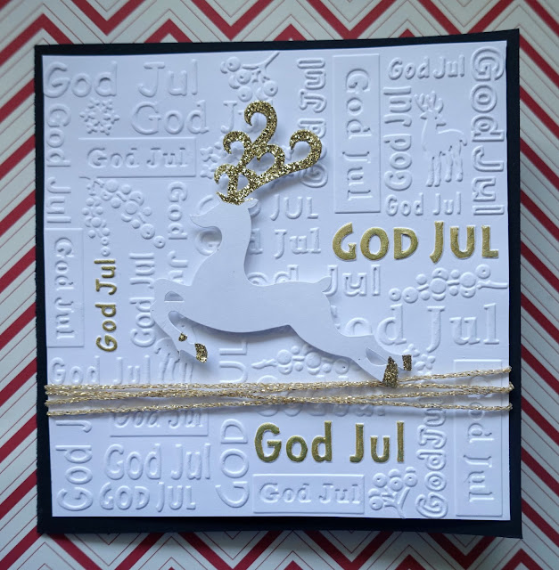 Här har jag använt en embossingfolder som jag köpte i Miankas Scrapbookingbutik i Våxtorp och sedan har jag bara fyllt i några texter med en guldpenna. En hjort från förrådet och lite guldgarn.